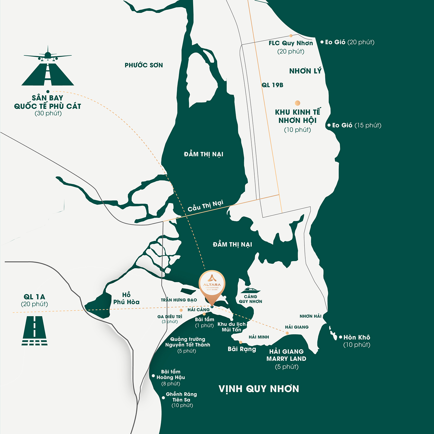 Tọa lạc tại 76 Trần Hưng Đạo, P. Hải Cảng, TP. Quy Nhơn, chỉ cách biển hơn 200m, ga Quy Nhơn 2km, sân bay Phù Cát 30km… Altara Residences sở hữu vị trí đắc địa trung tâm TP. Quy Nhơn. Từ Altara khách hàng có thể dễ dàng kết nối với mọi địa điểm trọng yếu trong và ngoài khu vực cũng như các tỉnh thành lân cận khác thông qua hàng loạt các tuyến đường huyết mạch như: Xuân Diệu, Nguyễn Huệ, Phan Chu Trinh…